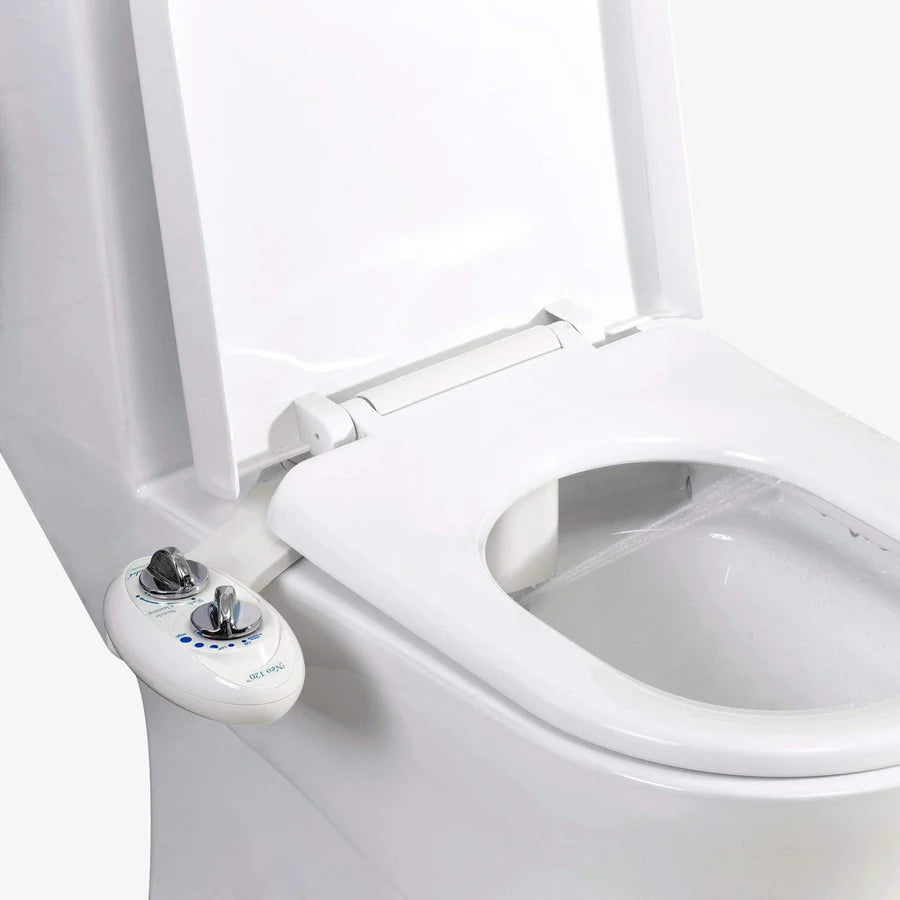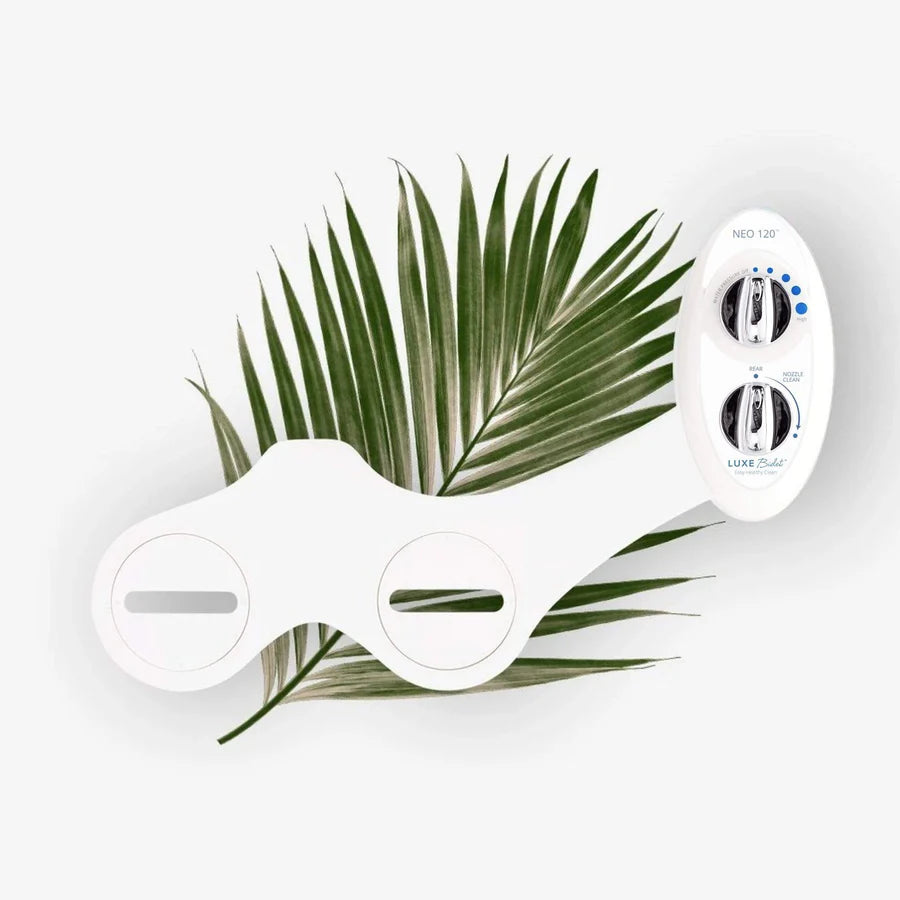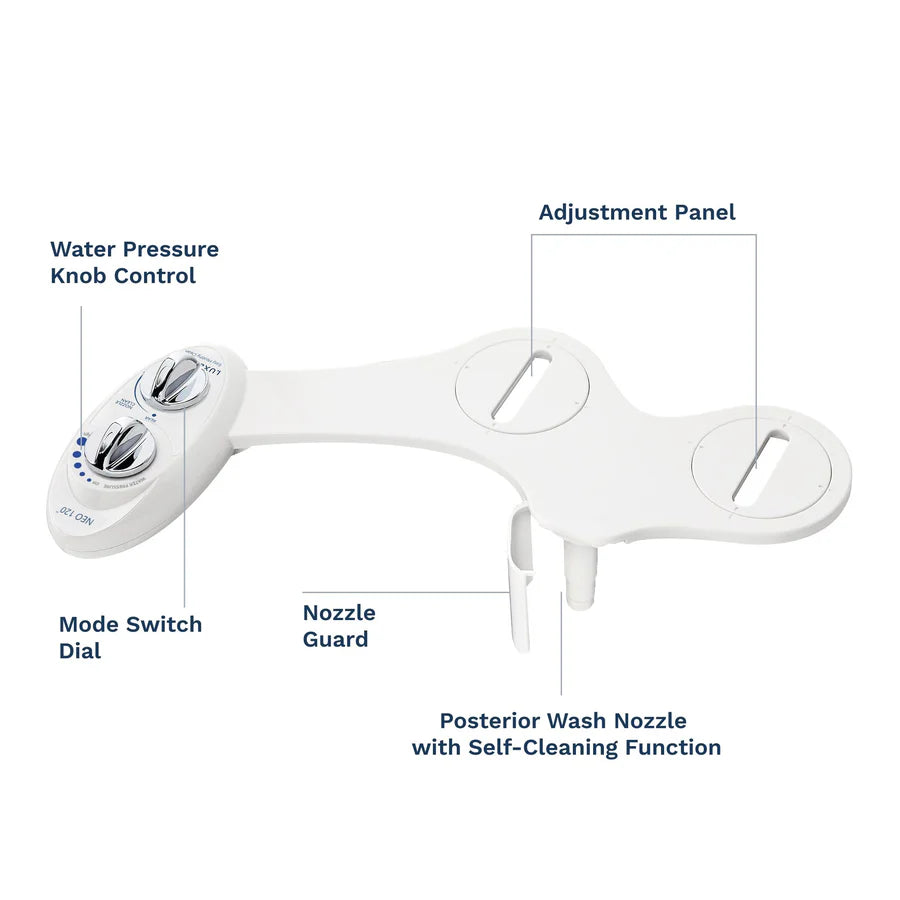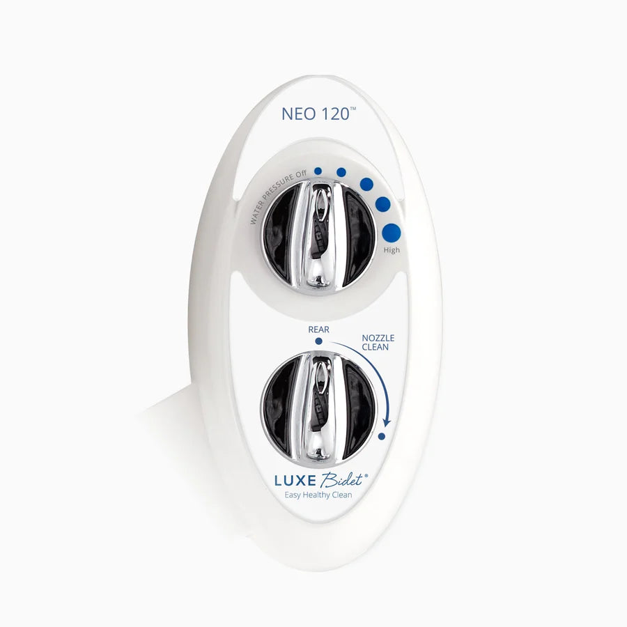 The LUXE Bidet® NEO 120 is a fresh water mechanical bidet attachment, equipped with a single wash nozzle along with mode and water pressure control knobs that are simple to operate. During use, the nozzle extends below the guard gate and after use, the nozzle retracts into its housing. The NEO 120 also features an innovative self-cleaning mode that rinses the nozzle with fresh water.